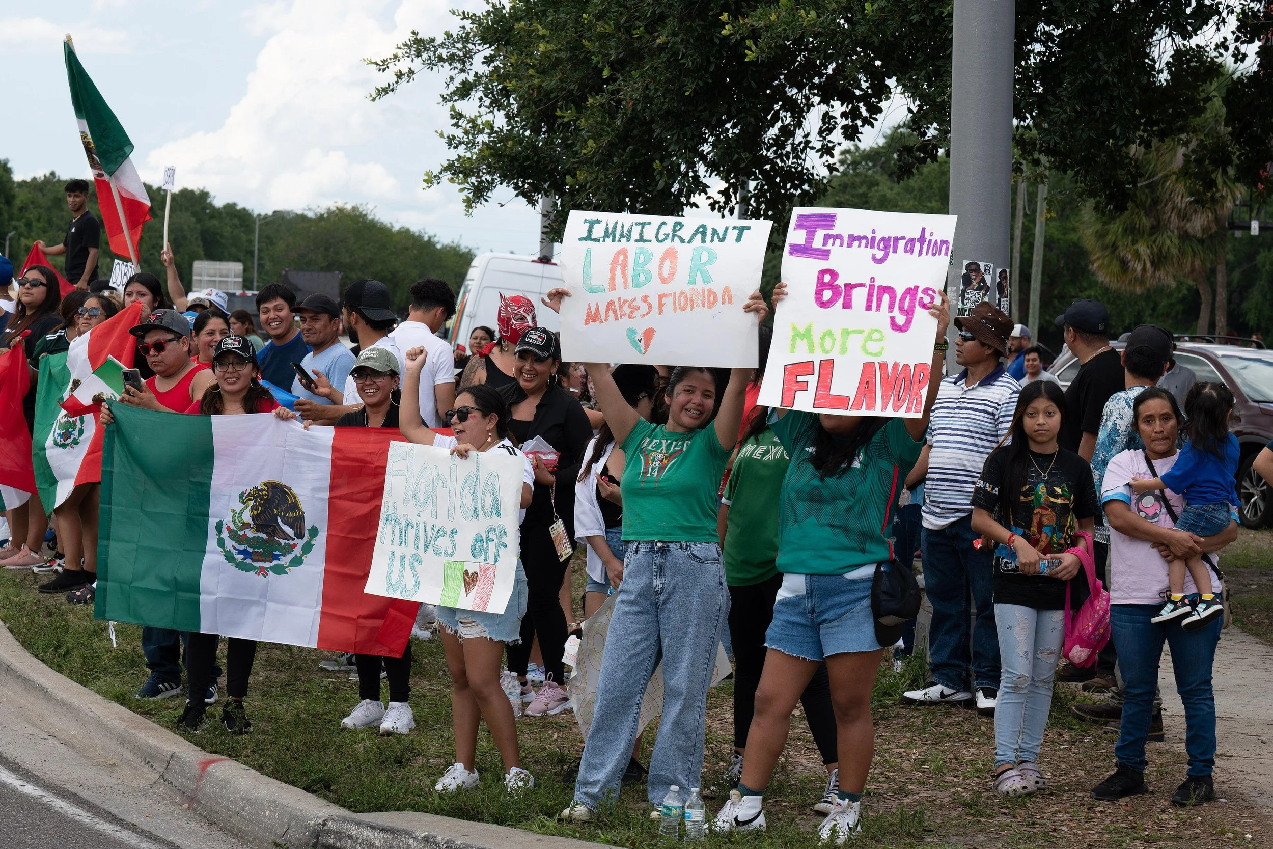 Hundreds of members of Tampa's Hispanic community gather at a busy intersection to protest Florida's newly-passed immigration law on June 1, 2023. Photo by Robin Rayne/ZUMA Press Wire/Alamy