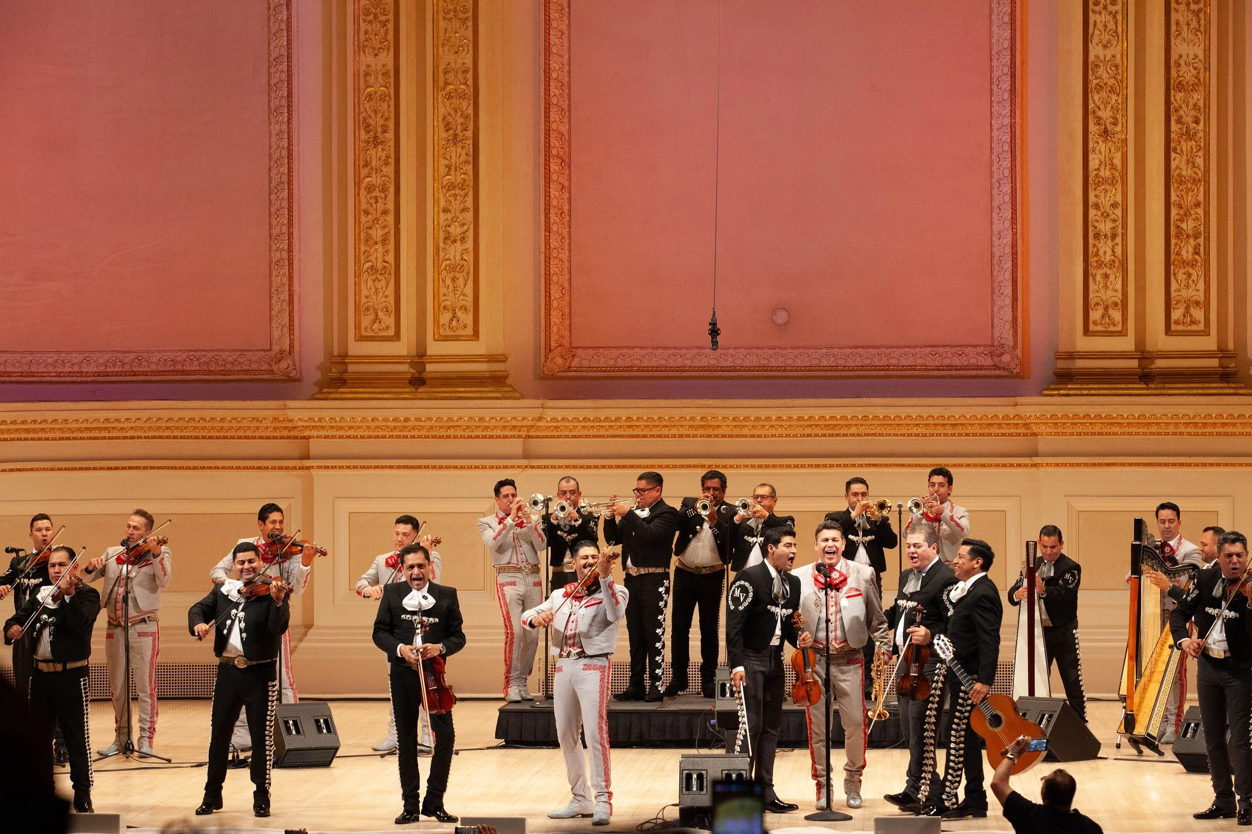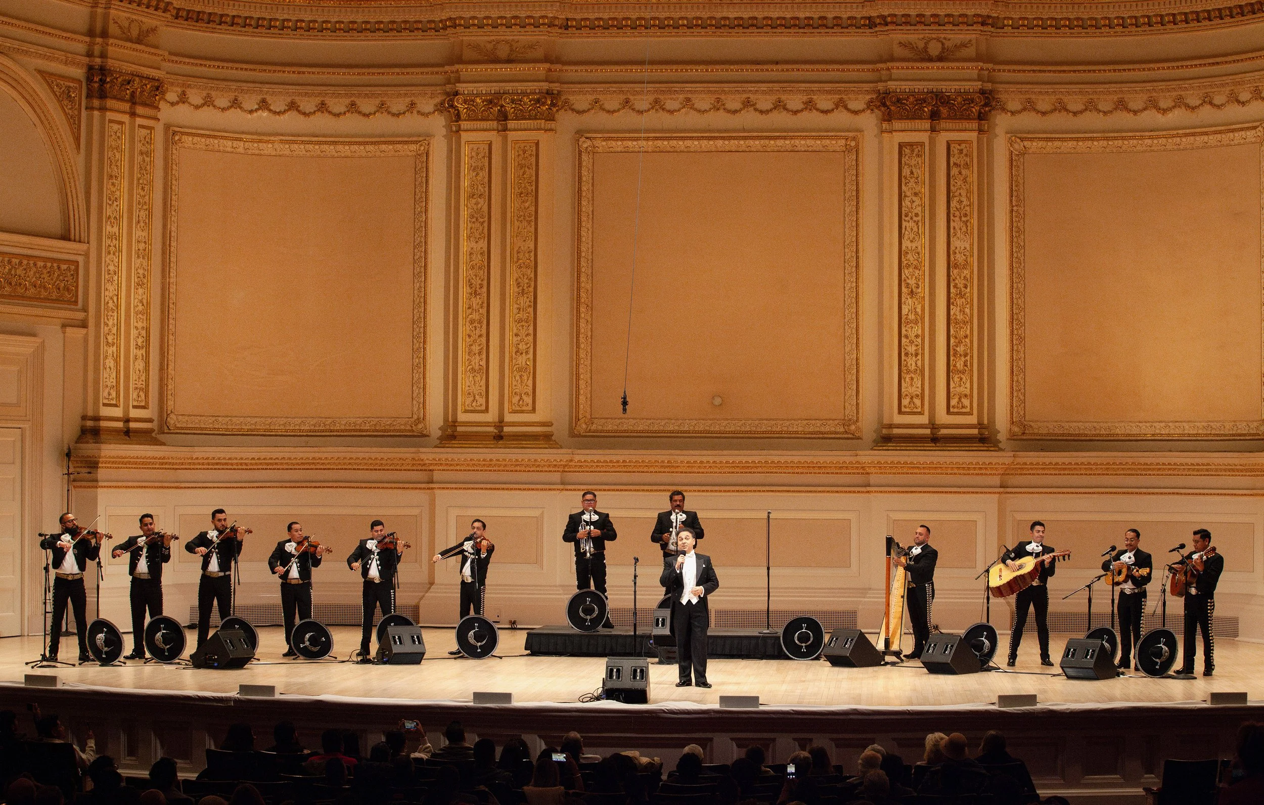 Mariachi Real de México performs with opera singer José Adán Pérez on stage at Carnegie Hall on Oct. 14, 2025. The concert, led by Ramón Ponce Jr., was the first time Carnegie Hall dedicated an entire evening to mariachi music. Photo by Photo by Alesandra Tejeda for palabra
