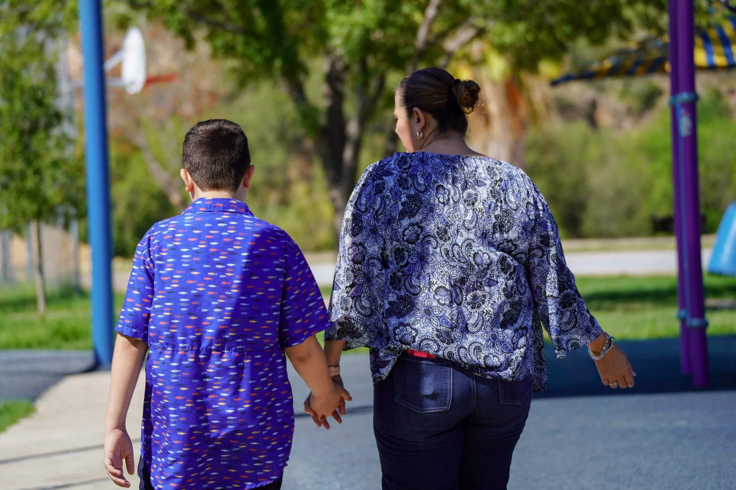 Nidia Nevares walks with her son, Juan Jose "JJ" Nevares, at Father Charles M. McNaboe Park on Sept. 20, 2025. The park is near both their home and the Midwest Sterilization Co. plant, which uses a known carcinogen. Photo by Sean Jimenez/South Texas Project