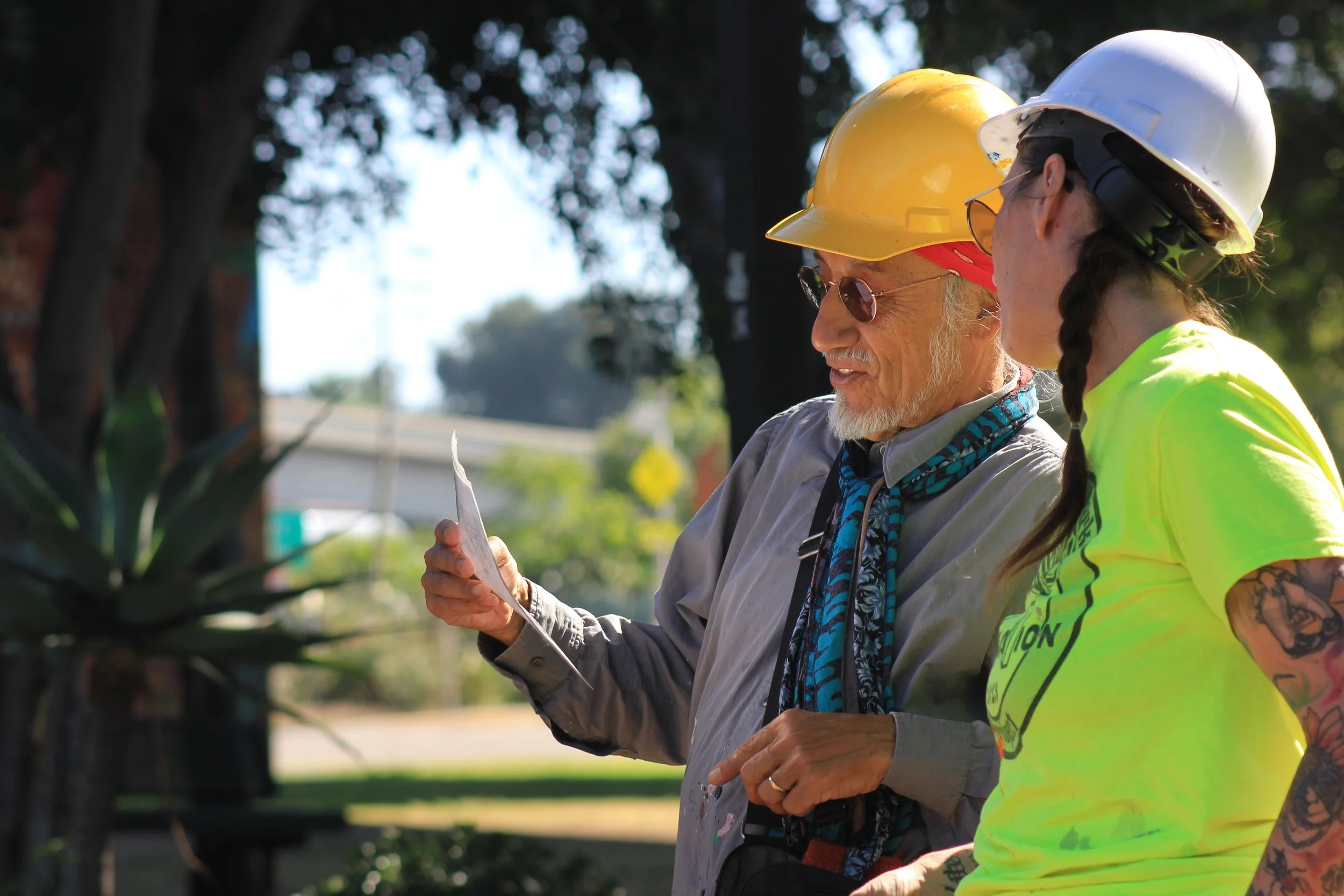 Mario Torero and Shirish Villaseñor looking over their plans for the day. Chicano Park Mural Restoration Project 2023