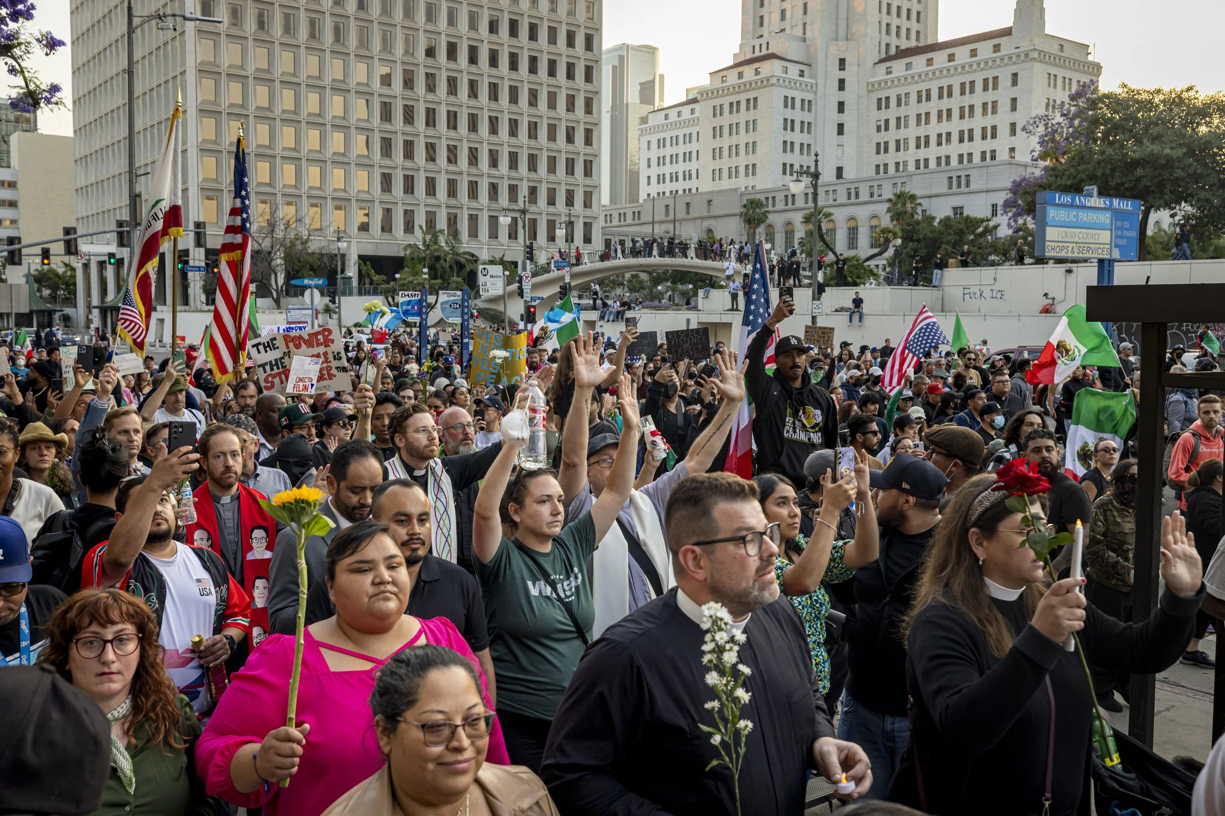 Religious leaders conduct a vigil outside the L.A. Detention Center as protests continue following clashes with police after immigration raids on June 10, 2025 - the same day the Department of Homeland Security on X posted video of protests taken by a drone. Photo by Michael Nigro/Sipa USA, via AP Images
