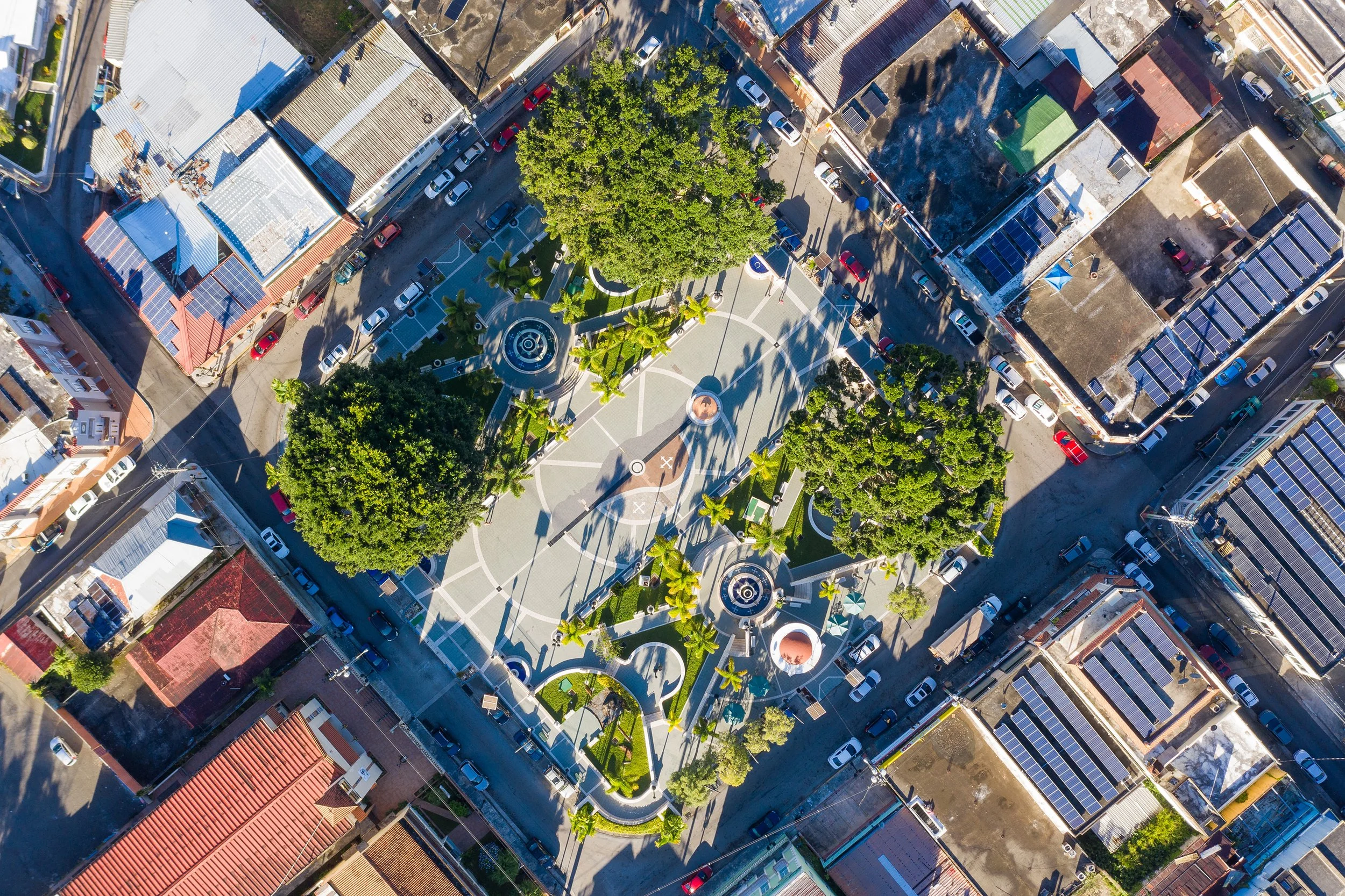 The Adjuntas town square surrounded by buildings with solar panels installed by Casa Pueblo. Photo courtesy of Casa Pueblo