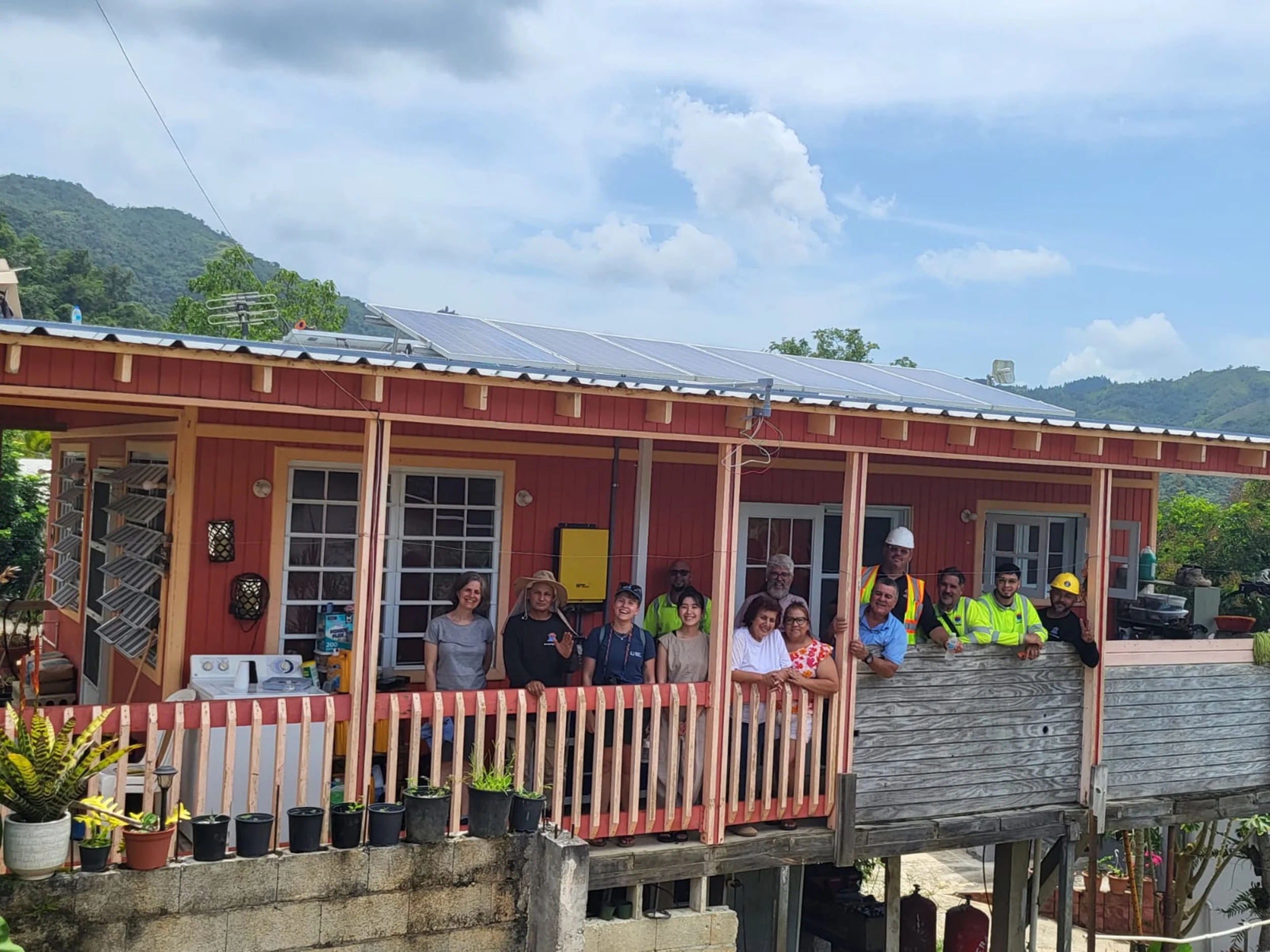 Casa Pueblo staff, Mennonite Central Committee staff, and Sol de la Montaña staff come together to install solar panels at a family home in Adjuntas, Puerto Rico, May 2024. This partnership hopes to support solar projects that provide energy security to vulnerable island families. Photo courtesy of Casa Pueblo