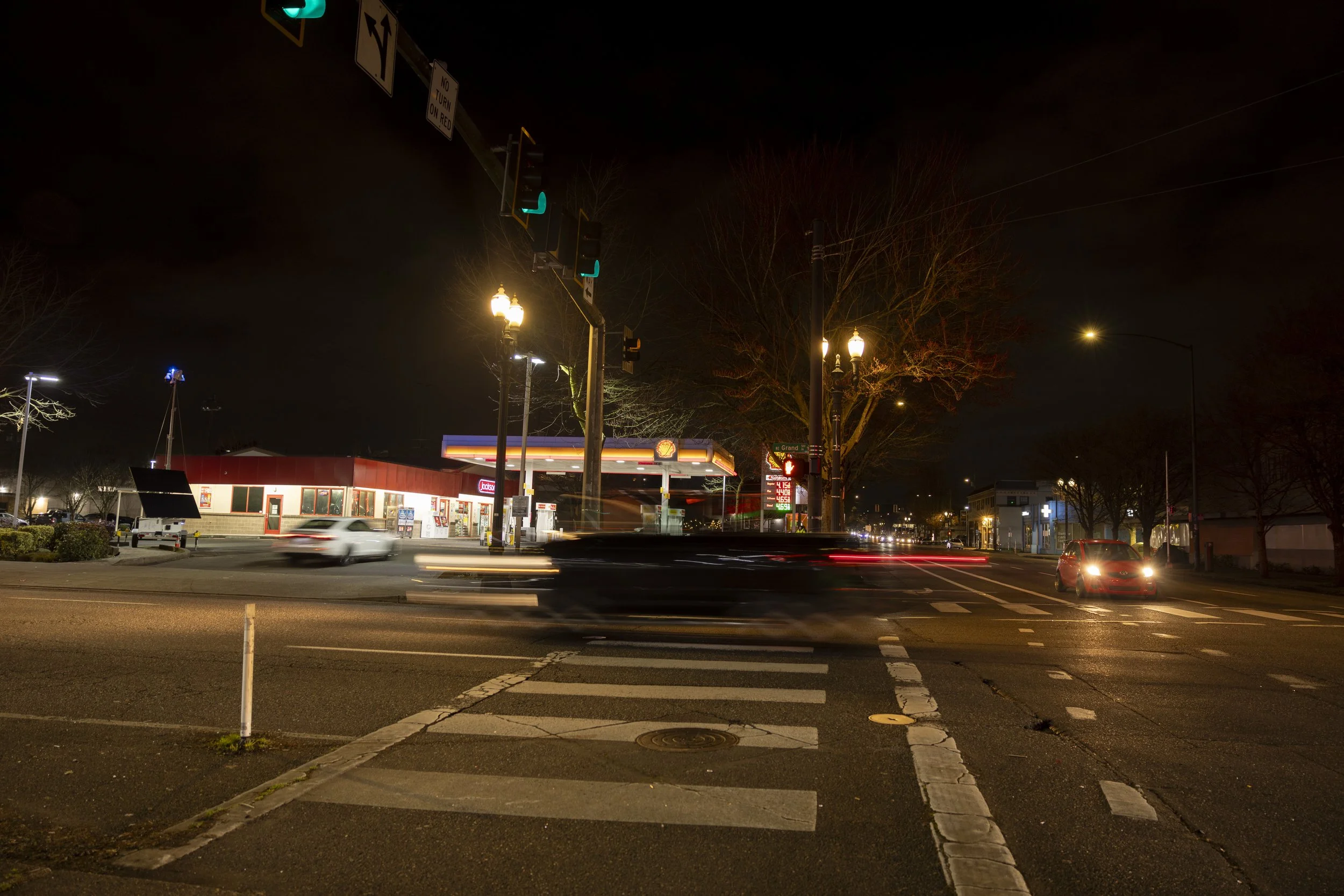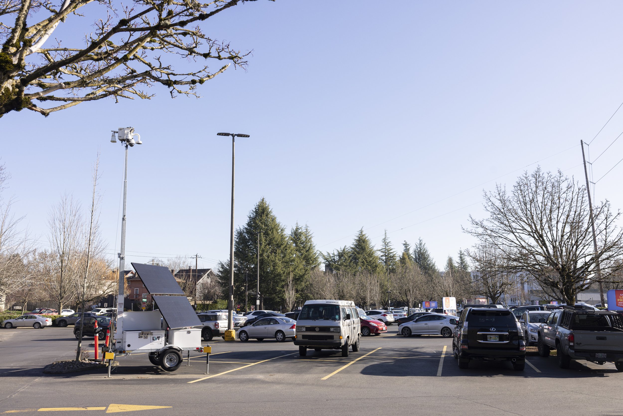 An ALPR is stationed at a gas station along the busy intersection of NE Grand and Broadway in Portland, Oregon, on March 4, 2026. Photo credit: Celeste Noche / Fi2W.