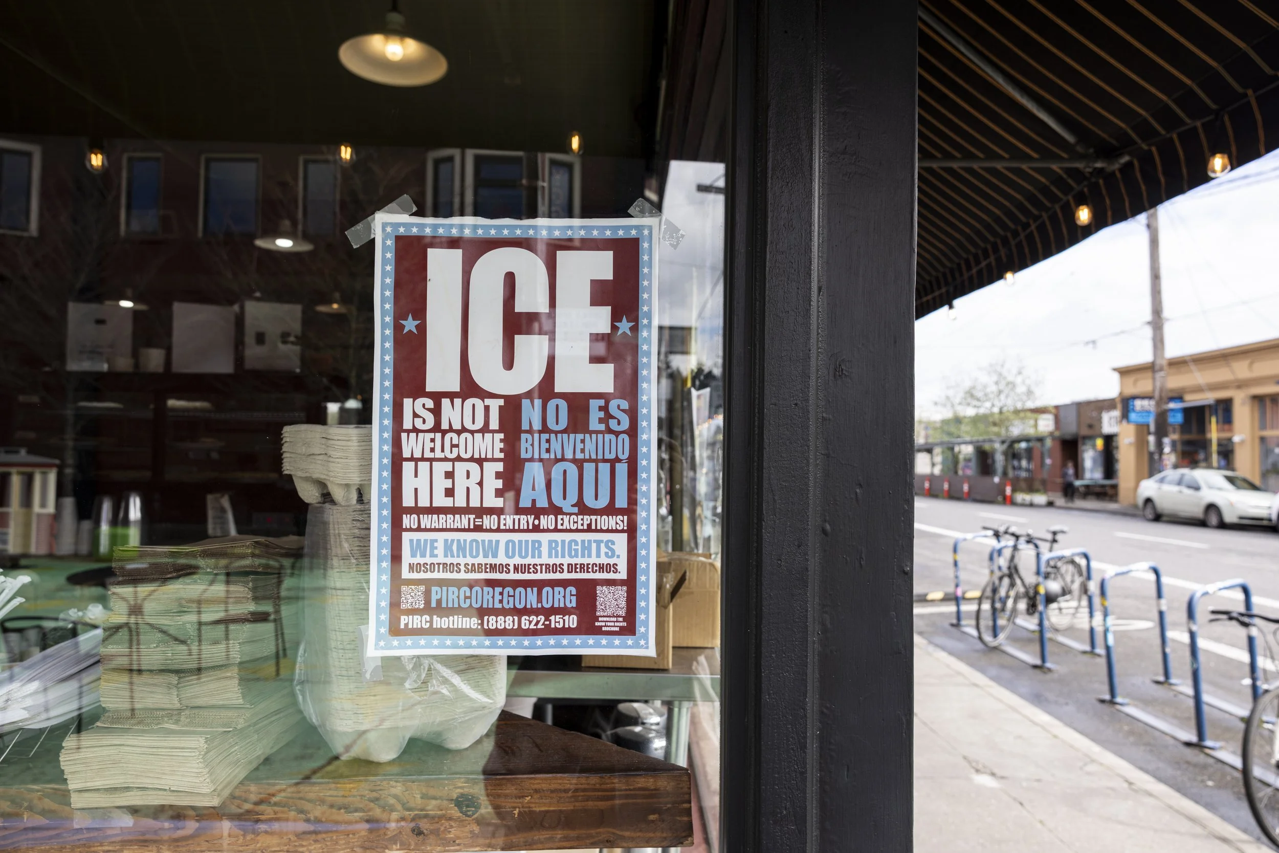 Local businesses like Bipartisan Cafe in Southeast Portland, Oregon, hang signs in support of immigrant communities on March 4, 2026. Photo credit: Celeste Noche / Fi2W.