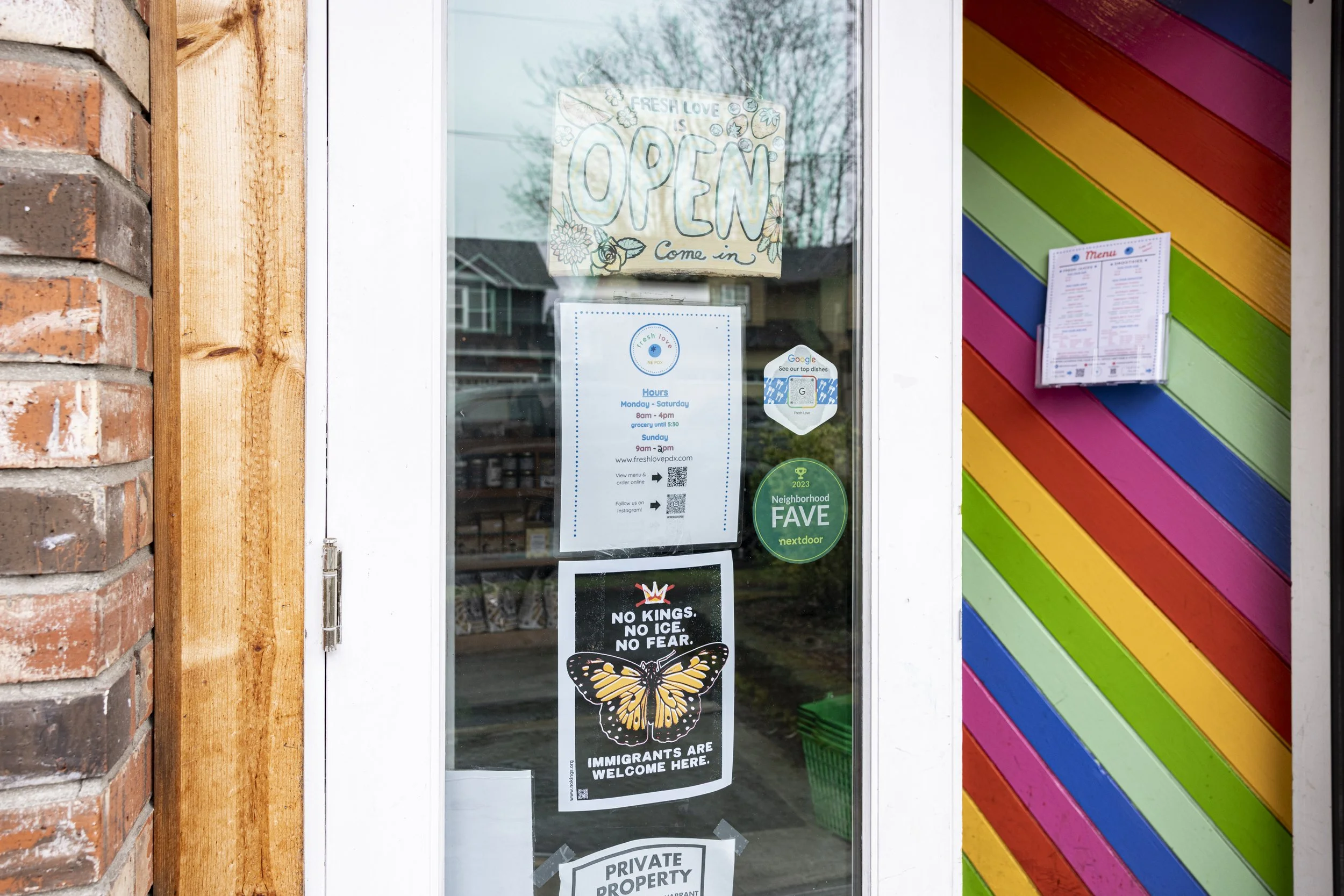 Local businesses like Fresh Love in Northeast Portland, Oregon, hang signs in support of immigrant communities on March 4, 2026. Photo credit: Celeste Noche / Fi2W.