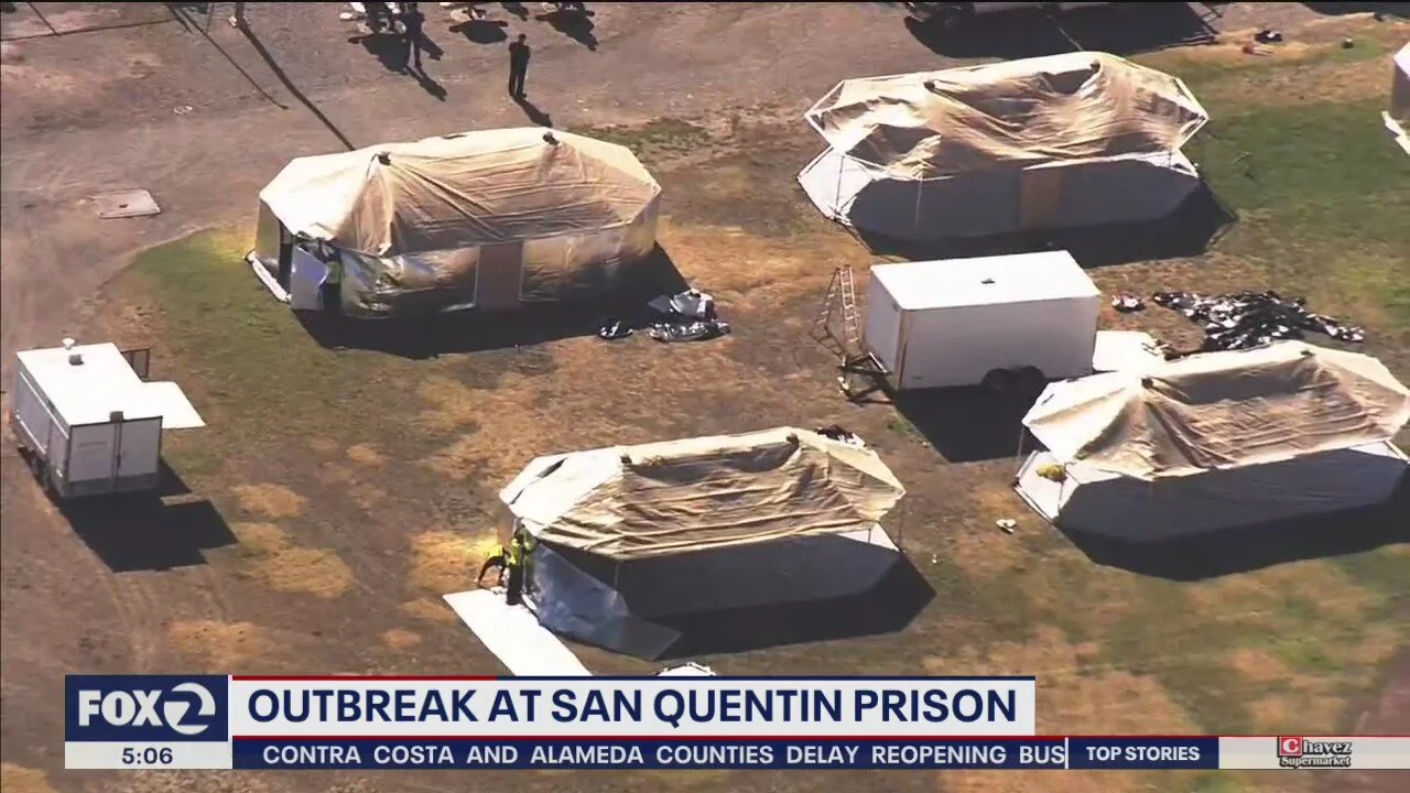 Television news aerial shot of temporary camps set up on the San Quentin state prison grounds, after an outbreak of COVID-19.